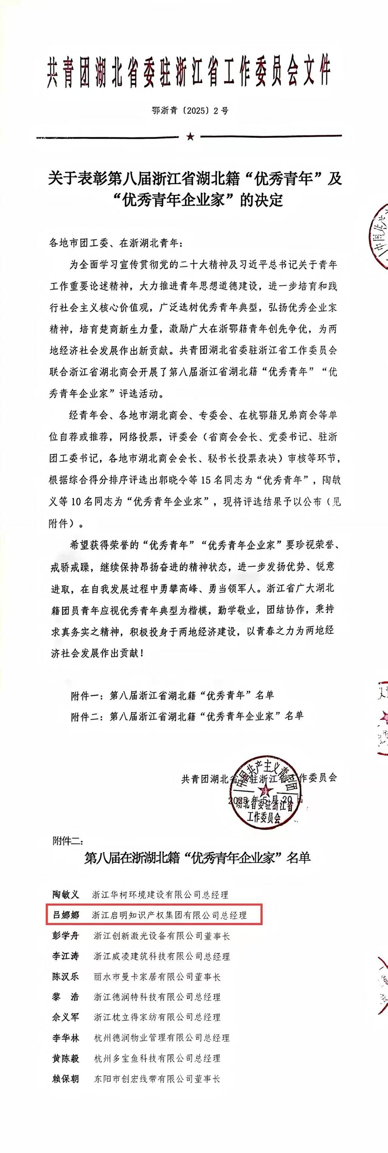 近日,第八屆浙江省湖北籍“優(yōu)秀青年”及“優(yōu)秀青年企業(yè)家”評選結(jié)果正式揭曉,我司總經(jīng)理呂娜娜榮獲浙江省湖北籍“優(yōu)秀青年企業(yè)家”稱號。